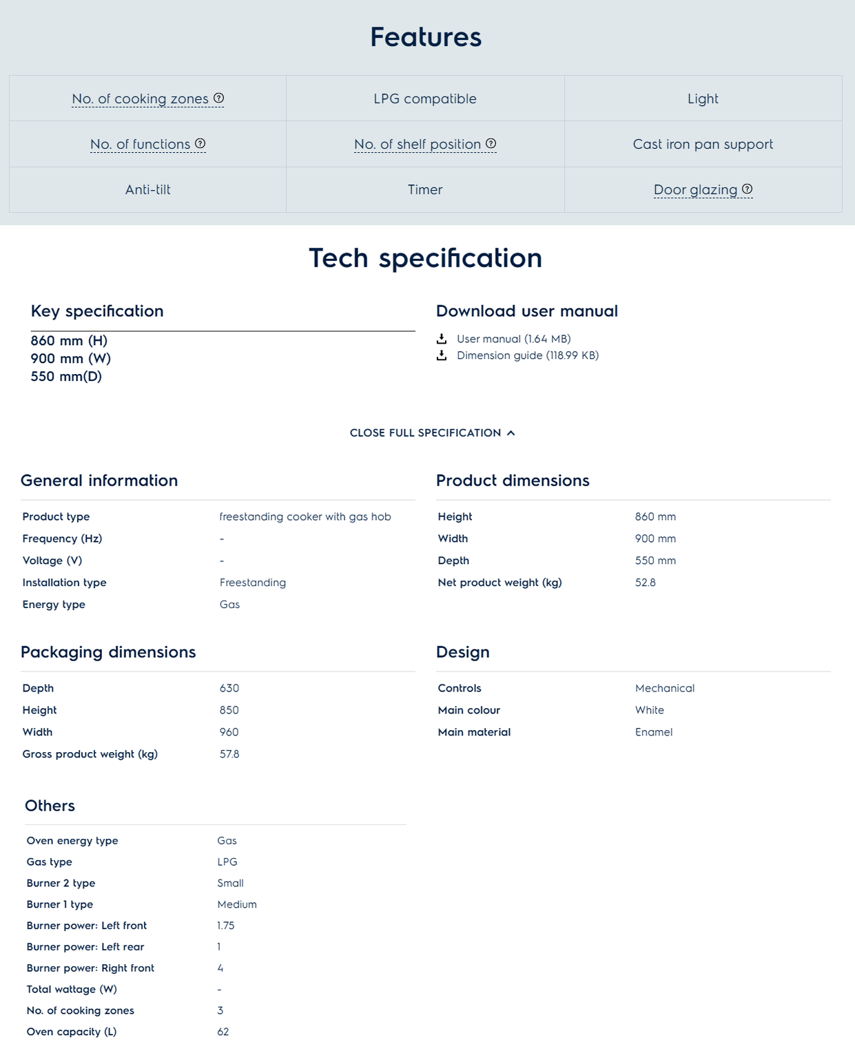 A generous oven capacity makes it easy for you to serve up a feast of delicious, hot dishes at the same time when entertaining. The gas oven ensures that everything from crisp roast chicken to delicate meringues are cooked quickly and evenly.