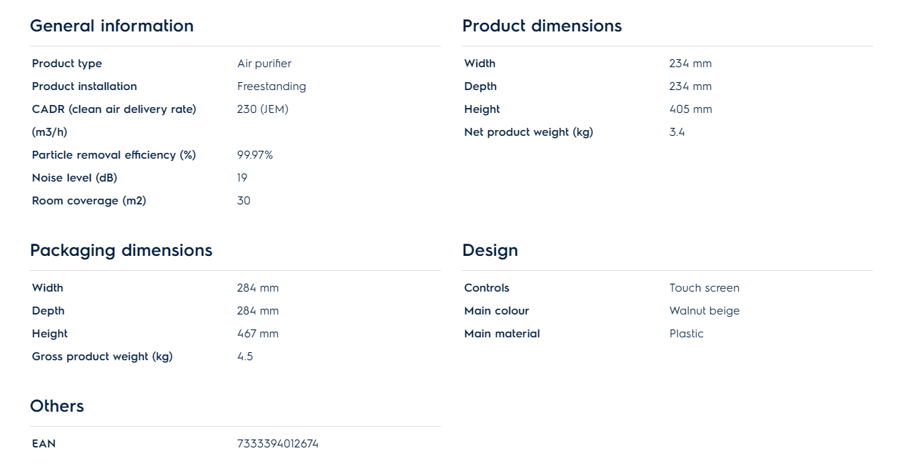 The AirSurround system creates a powerful, yet smooth, spiral movement that efficiently circulates filtered air around your home. The spiral outlet creates a robust whirl to efficiently circulate air, delivering purified air throughout a 17 m2 room within just 15 minutes with AHAM Smoke CADR of 226 m3/h¹.