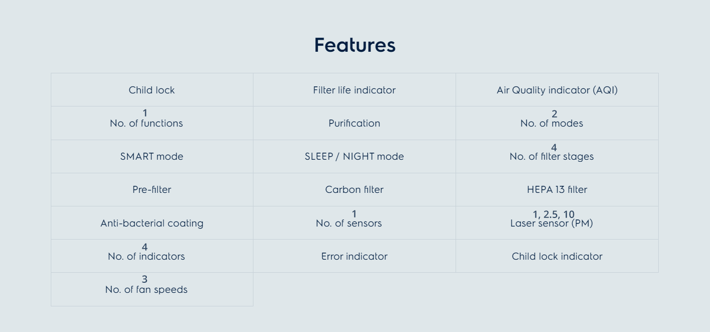 ¹Tested to ANSI-AHAM-AC1 for CADR. Applicable room size in 17 m2 and cleaning time in minutes are derived from the corresponding CADR value.
