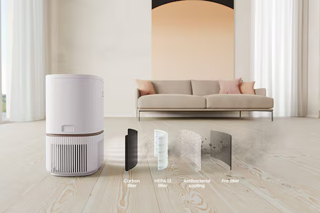 The activated carbon air filter assists in the removal of odours and up to 87% of harmful gases¹ such as TVOCs (Total Volatile Organic Compounds), which are emitted by household products such as paint, cleaning supplies, and tobacco smoke.
