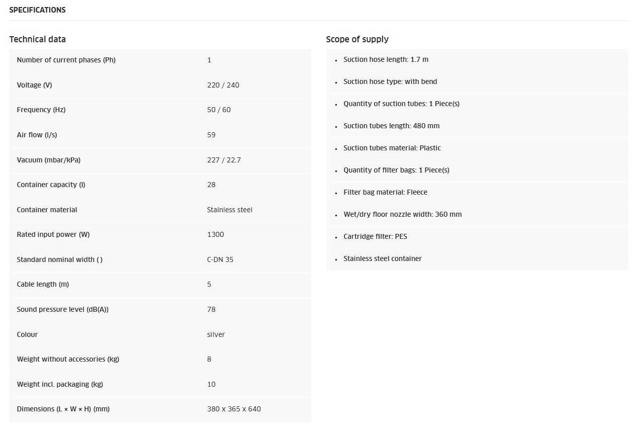 Equipped with our clever Easy Service system, our NT 30/1 Classic wet and dry vacuum cleaner with innovative cartridge filter is very economical in upkeep and maintenance. This is also guaranteed with the large permanent filter basket that makes possible optional dust separation and continuous vacuuming without a filter bag. The powerful machine with 30 litre container has a 1300 watt turbine for effortless vacuuming of medium-sized quantities of dust, coarse dirt and liquids and is also very easy to manoeuvre thanks to its compact dimensions.