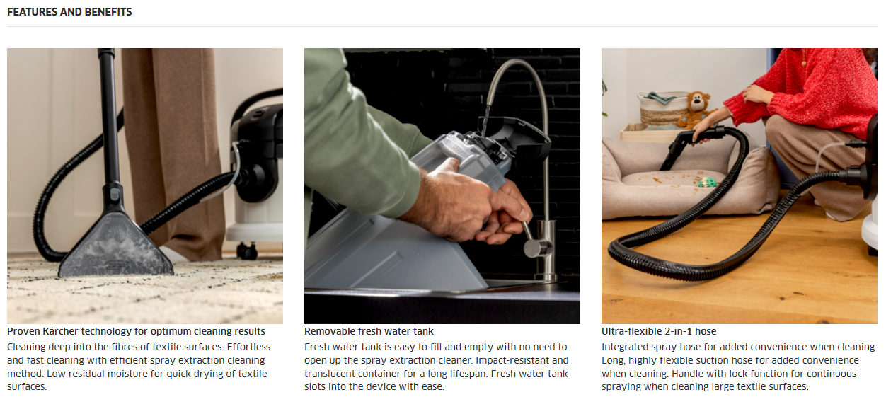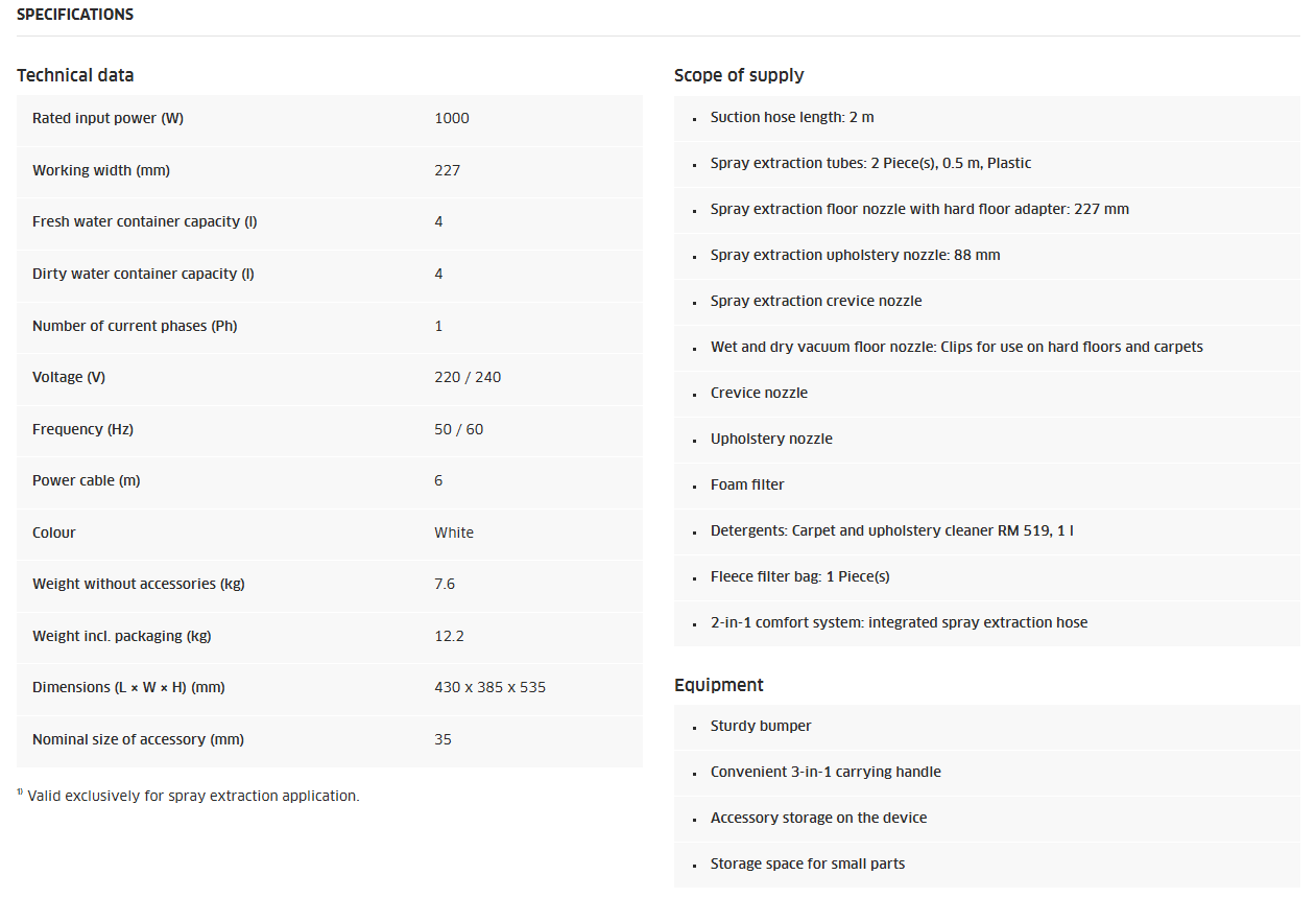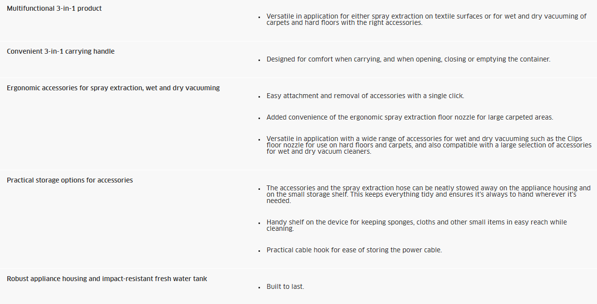 Deep cleaning impact combined with ergonomic design and multifunctionality: the SE 4 spray extraction cleaner with its attractive pull-behind design ensures a hygienic clean right down to the fibres of many textile surfaces. Tried-and-tested spray extraction technology from Kärcher delivers the best cleaning results: fresh tap water and the Kärcher Carpet Cleaner RM 519 are sprayed deep into the textile fibres under pressure and then vacuumed back up together with the loosened dirt – ideal for families, allergy sufferers and households with pets. The device is a multifunctional 3-in-1 product, also working as a fully-fledged wet and dry vacuum cleaner. The large translucent 4-litre fresh water tank is impact-resistant and can be removed, making it is easy to fill and empty. The dirty water that is vacuumed up is collected in the container. The 3-in-1 carrying handle is designed to make carrying, opening, closing and emptying the container hassle-free. The accessories supplied can be neatly stowed away on the device itself. The device is easy to clean after use to ensure a long product life.
