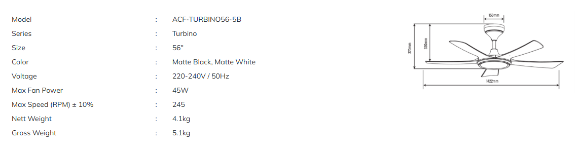 RUBINE CEILING FAN ACF-TURBINO56-5B-MB (DC) 56''