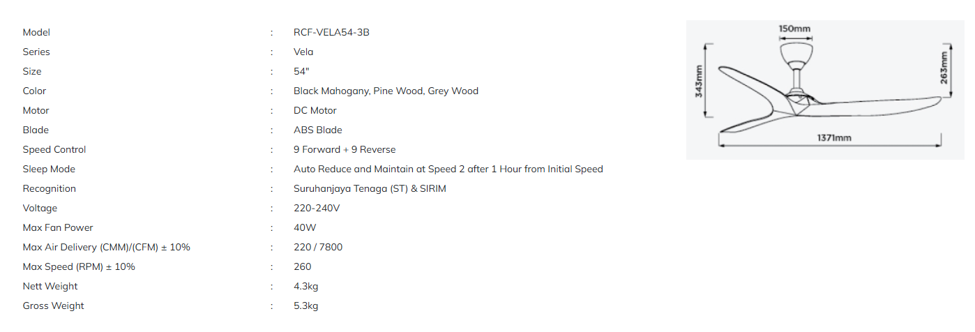 RUBINE CEILING FAN RCF-VELA54-3B-BM (DC) 54''