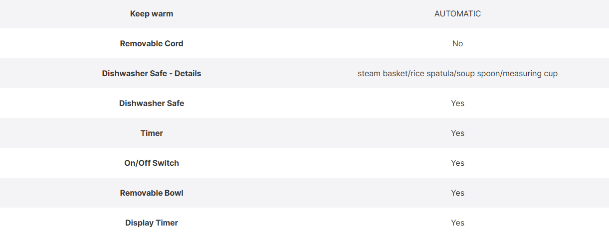 •Smart digital cooking automatically adapts to the amount of rice, adjusting power and time for consistently tasty results