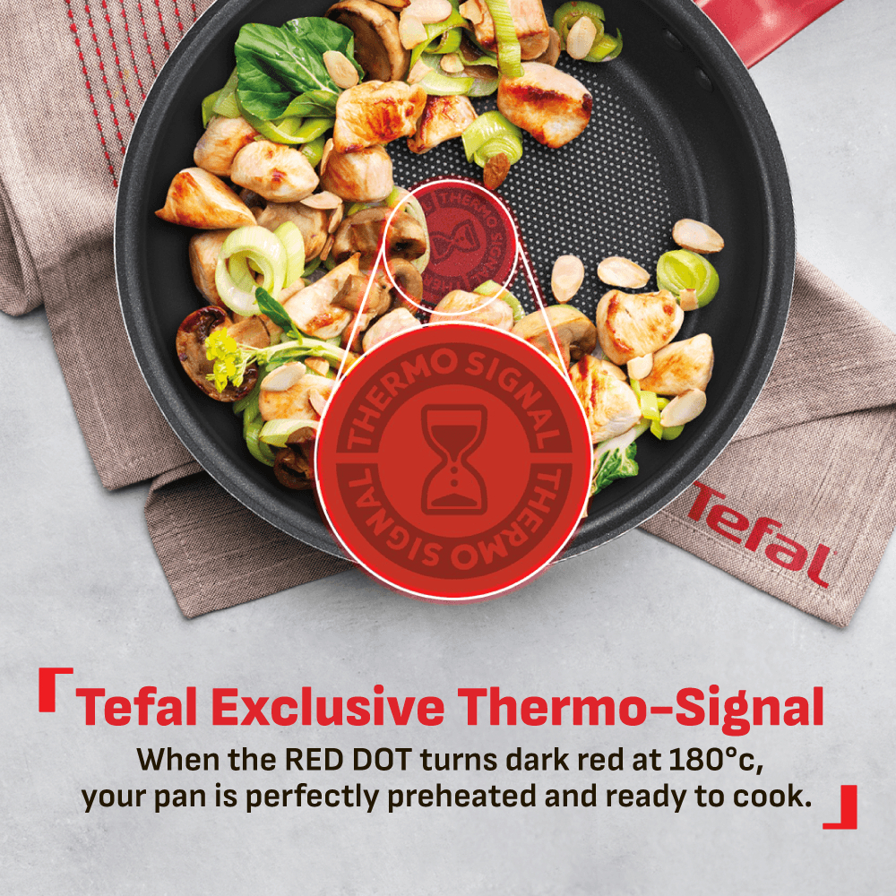 • Thermo-Signal™ heat indicator changes color when the pan reaches the ideal starting temperature, for flawless searing