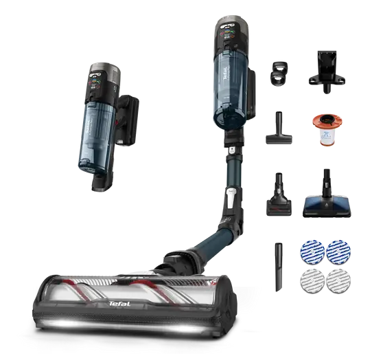 Cordless stick vacuum cleaner with 150 Air Watts and a new motorized brush for deep cleaning everywhere—even carpets, Cutting-edge technology with automatic suction power adjustment by floor type for smart and optimal cleaning, Long-lasting removable battery for a running time up to 60 minutes* to cover your entire home on a single charge, A slim and lightweight design that's only 1.6 kg in handheld mode for cordless cleaning in total comfort, Aerospin technology for 2-in-1 active washing and efficient vacuuming, to remove dirt and encrusted stains, Flex tube design for cleaning everywhere without bending over, with LED bars for illuminated cleaning, Animal Care model with a versatile accessories package to clean your home from floor to ceiling, Smart technology: User-friendly screen displays battery level, power mode and filter cleaning alerts.